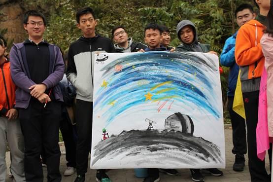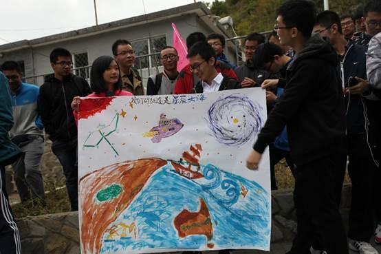 14日下午1点半,同学们在驻地停车坪集合。素拓教练给各队分别发放了纸、笔、颜料、画布等工具,40分钟后,同学们以队为单位介绍了各自的“展望未来”图画。各组都不约而同地加入了地空元素、北大元素,并表示会努力践行“脚踏实地,仰望星空”的公司精神。