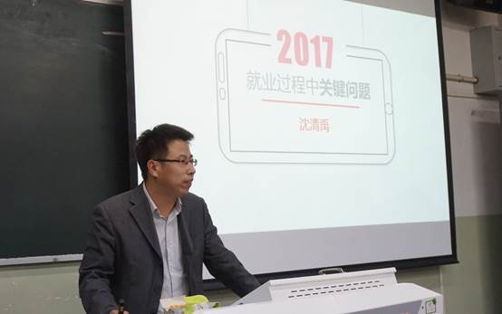 随后,沈清禹老师进行了题为“就业过程中的关键问题”的宣讲,沈老师的宣讲主要包括四个部分,分别为:如何建立信心、如何选择、测评方法概述和常见面试试题解析。沈老师同样抛出了一个问题“什么是成功”,并由此引出了找合适定位的工作才是最重要的这一论点。之后重点强调了无领导小组面试,无领导小组面试旨在考察同学们的领导能力、解决问题的能力,团队管理的能力和语言表达能力。沈老师建议同学们要认真审题,看出问题的本质并要注意关注团队。切忌过多的小动作,不发言,打断别人的发言。最后对同学们找到心仪的工作表示了信心。
