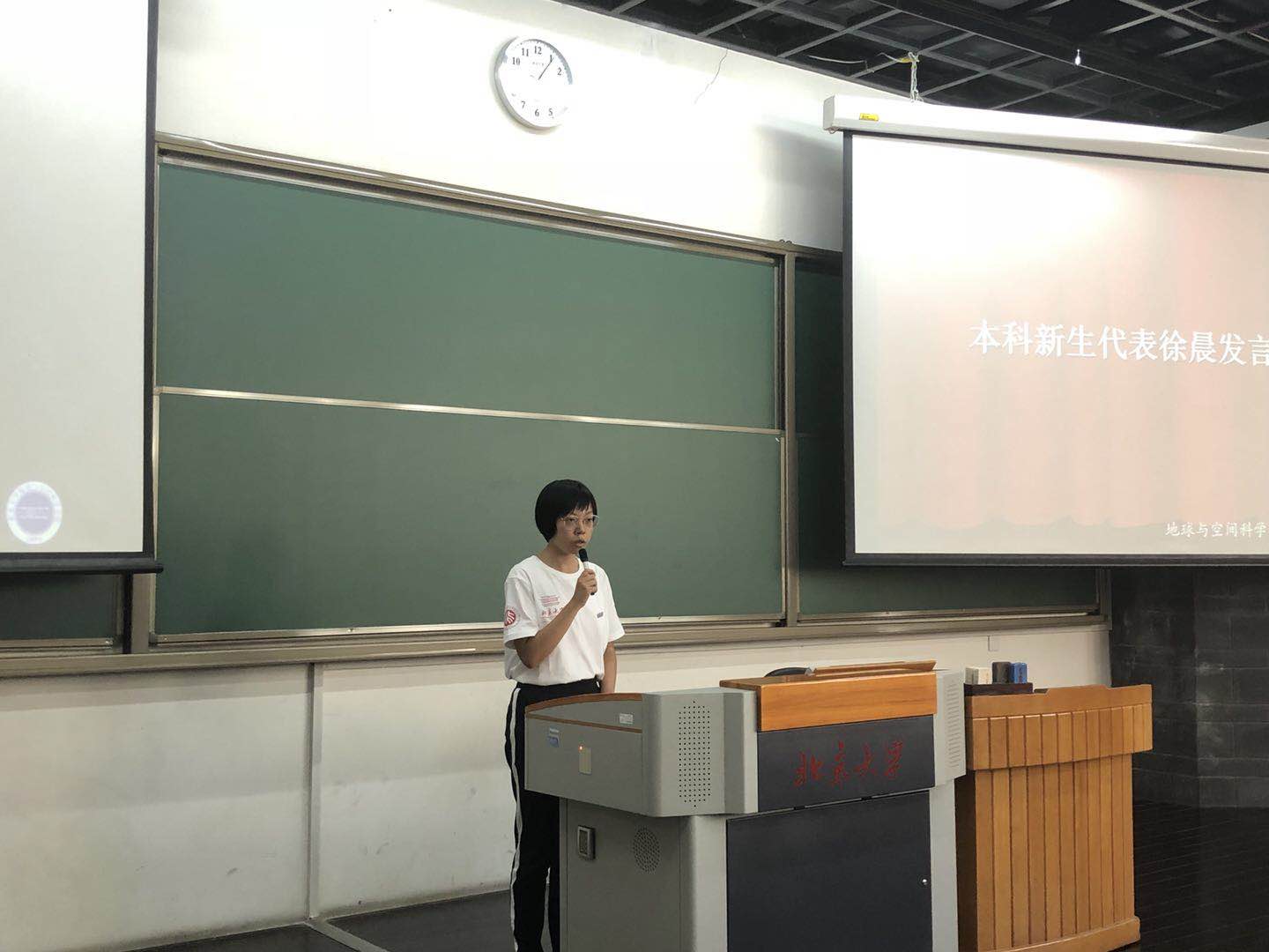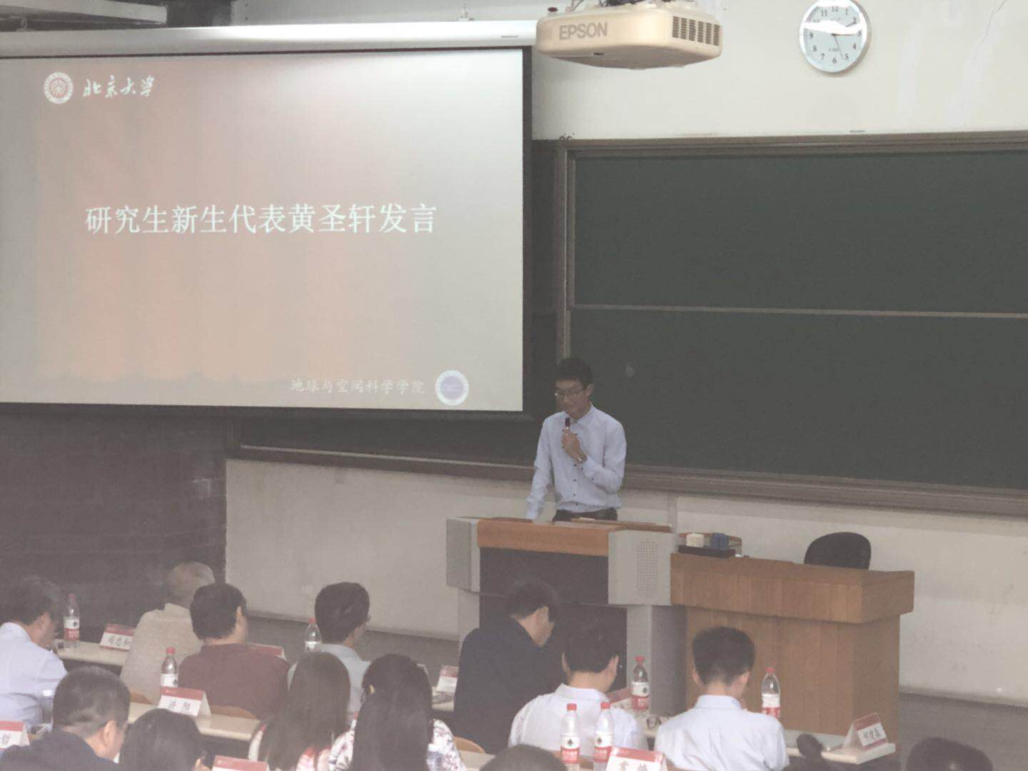 在校本科生代表王泽鑫在发言中回顾了地空这个大家庭给予他的关心和温暖。北大和地空,让他变得吃苦耐劳、严谨认真、怀有激情和理想;也让他不忘踏实脚下的每一寸土地。王泽鑫鼓励新生们,要用宽广的胸襟去承载地球科学的这份丰富而厚重,用清晰的大局观去完成星辰大海的征途。