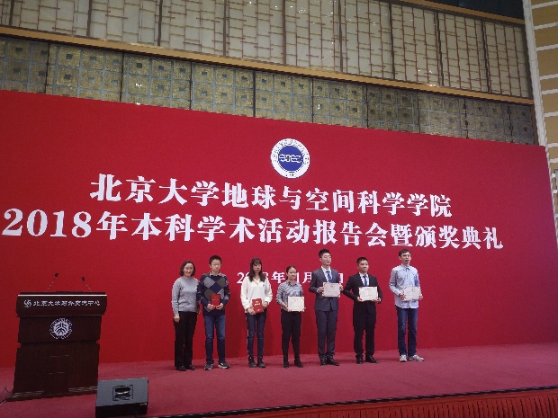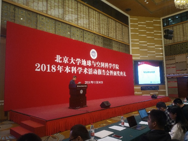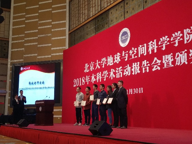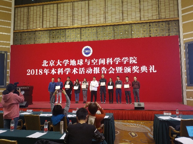 同时,现场还对过去一年中在本科生科研、野外实习等学术活动中取得优异成果的同学们进行了表彰。张波老师宣读了“颁发2018年本科生科研训练优秀项目奖的决定”,并为获奖同学颁奖。张老师表示,自己十分高兴能看到有很多同学在本科阶段就能参与到科研项目中。他认为这些同学通过本科生科研拓宽了自己的知识范围,培养了自己的动手、创新和科研能力,为自己未来的科研道路提供了良好的开端。田原老师则宣读了“颁发2018年本科生优秀实习报告奖的决定”,并与薛进庄老师为获奖同学颁奖。田老师提到野外实习是公司重要而且最有特色的教学项目,也同时说明了该奖项的设立旨在促进同学们夯实基础、结合理论与实践、建立正确的地学思维并树立正确的人生观和苦乐观。