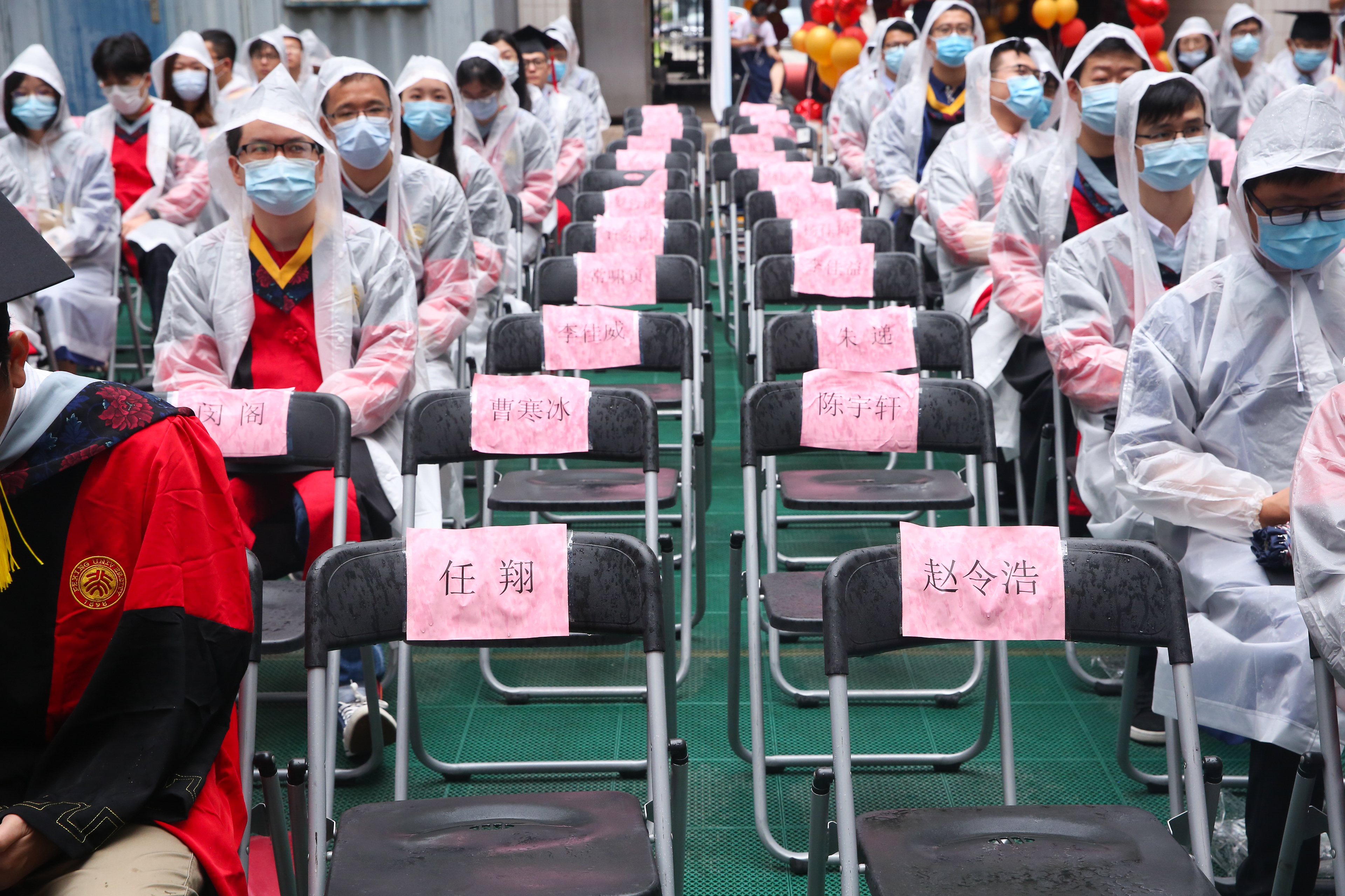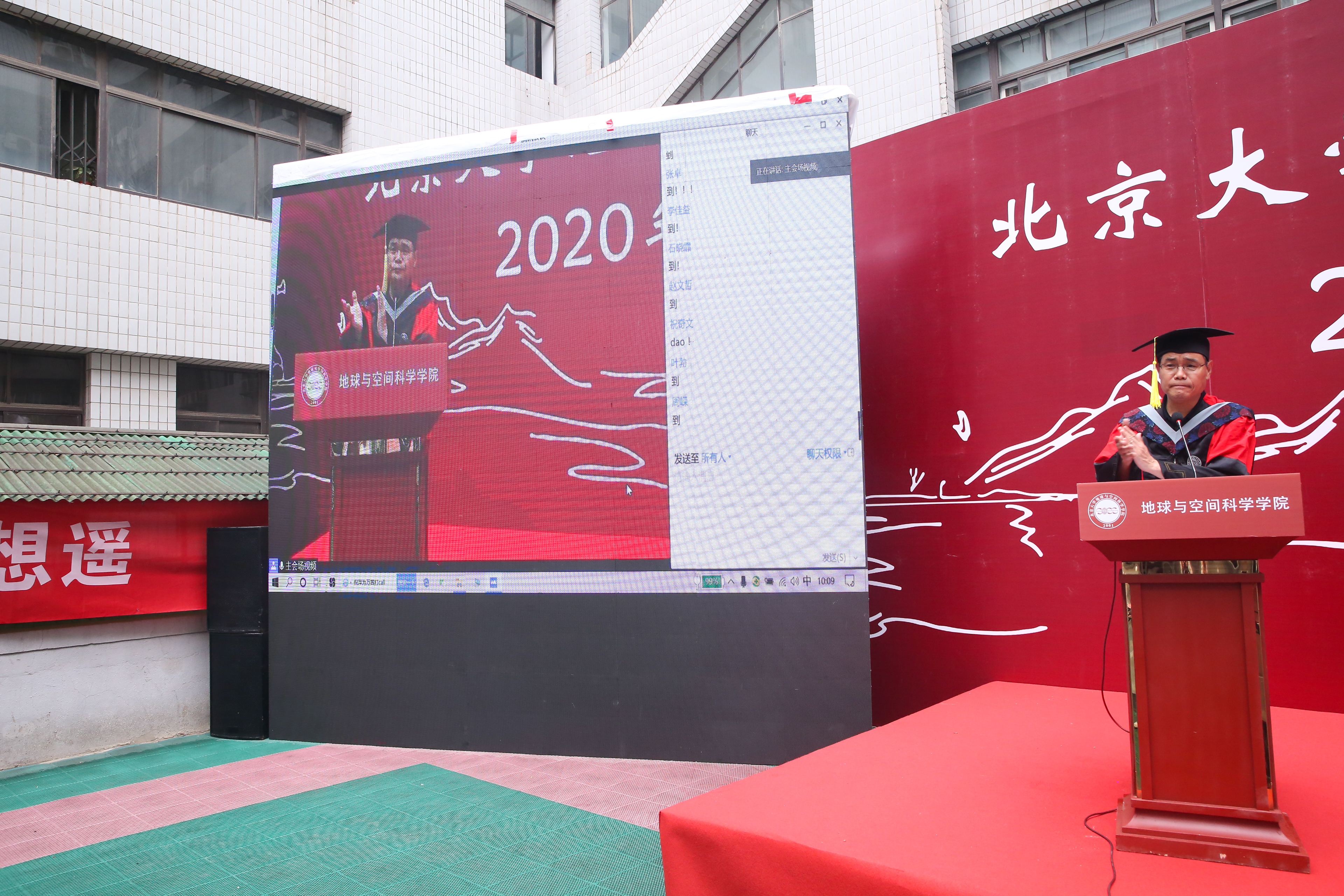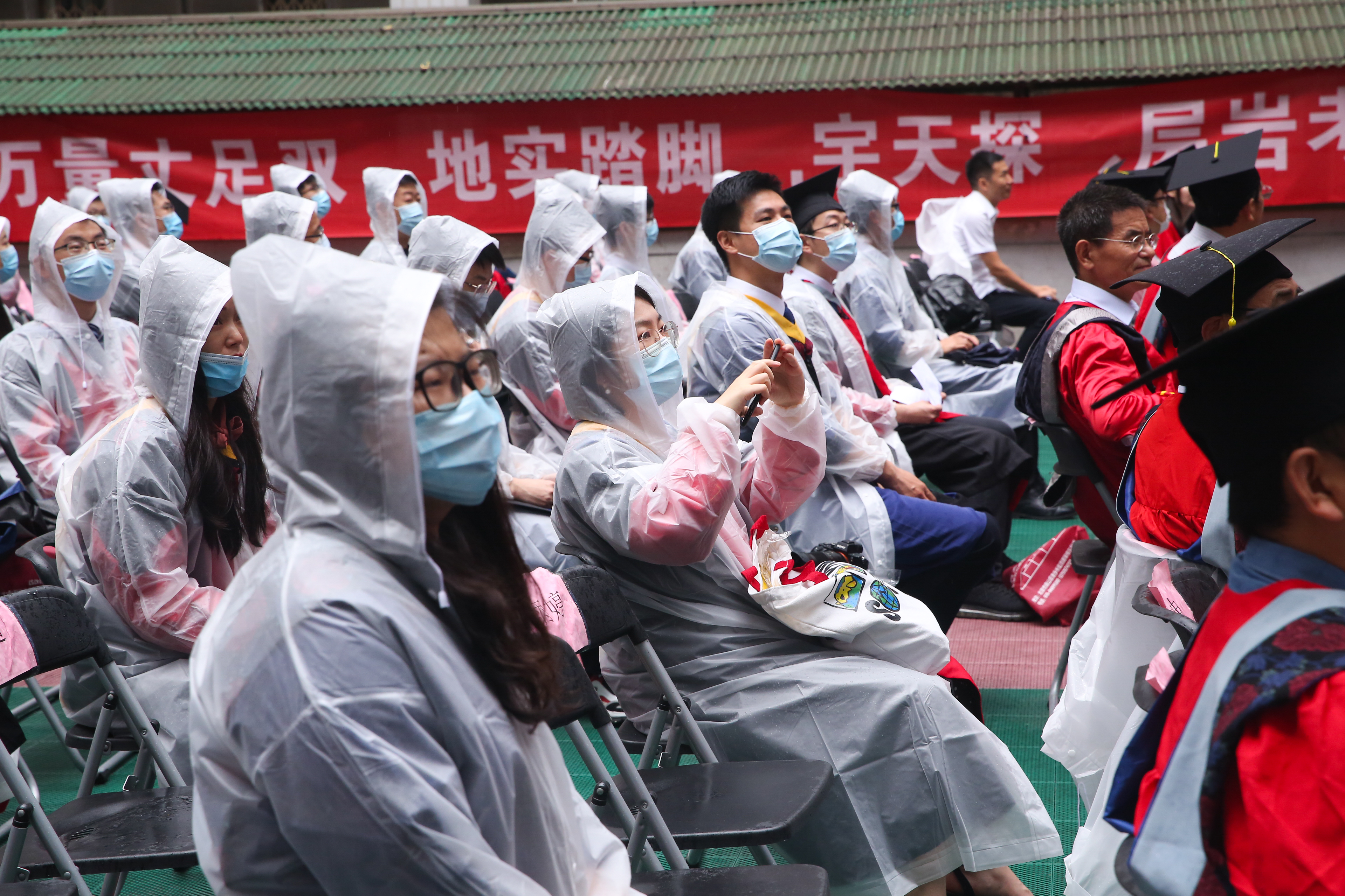 9点30分,2020年毕业典礼在庄严的国歌声中正式开始。师生共同欣赏了2020届毕业生的燕园生涯回顾视频,新生定向越野、一二·九大合唱、艰苦的野外实习、多彩的班级活动……这一幕幕难忘的场景,是同学们在北大最美的青春记忆。恰逢细雨,同学们感动的泪水与雨水都交织在了一起。