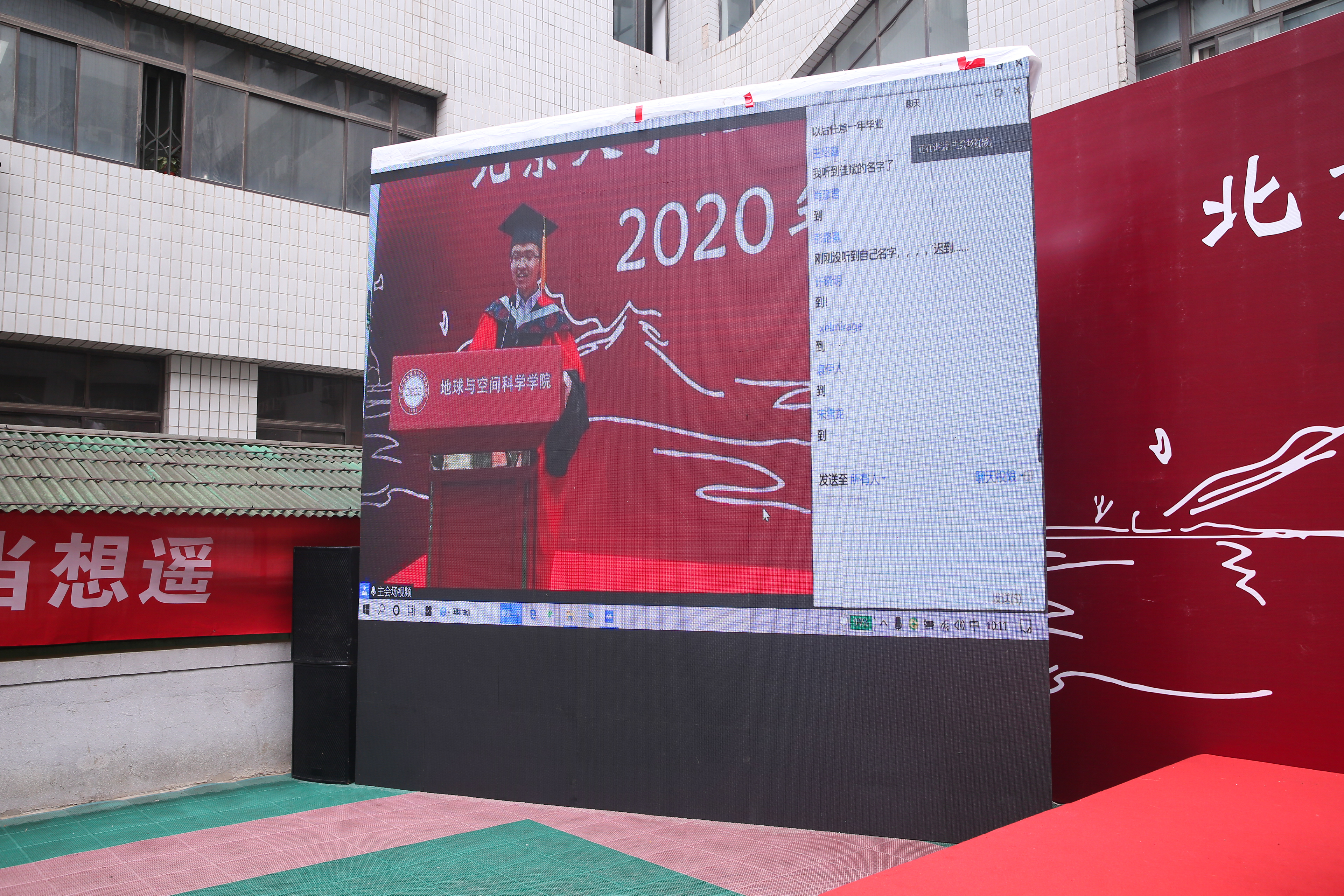 在典礼现场,公司为每一位未能返校的同学都摆放了座椅和名签,也专门设置了一面LED屏幕展示师生线上参与的情况,现场毕业生与线上师生通过现场大屏幕展示出来的聊天框实时互动,实现了无论身在何方,心都连在一起。