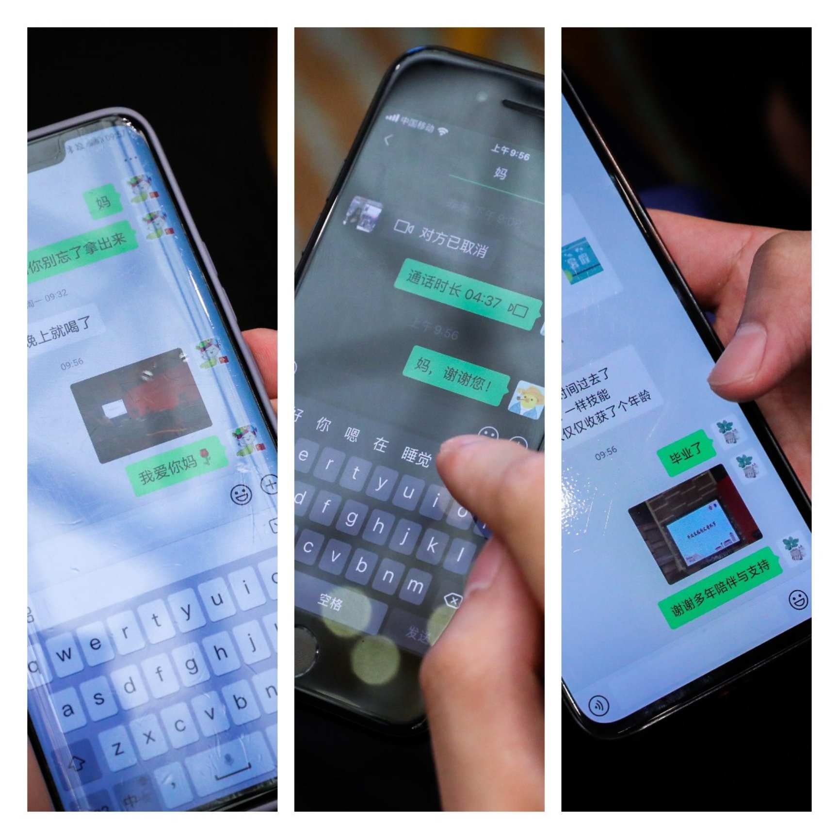 一路走来,父母也为毕业生们倾注了全部心血,大家纷纷拿出手机,用一条条包含感激和爱的短信,向父母说出了藏于心里多年的“我爱你、谢谢你”。