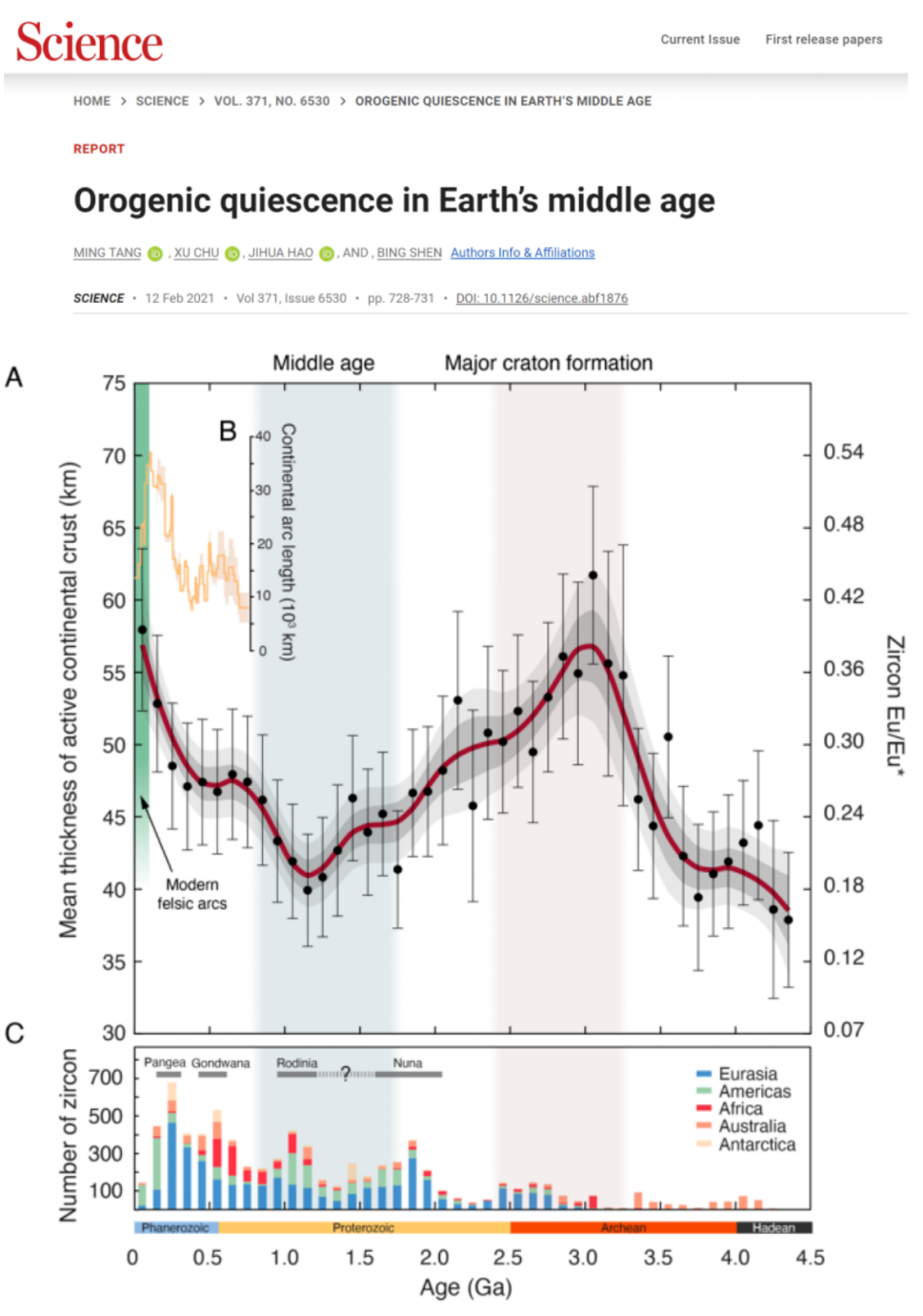 近乎“闭关”的生活为唐铭开启了一扇通往遥远过去的时空之门。在日复一日的沉寂中,“地球中年的造山沉寂”诞生了。2021年2月12日,研究文章Orogenic quiescence in Earth’s middle age发表在《科学》(Science)上。