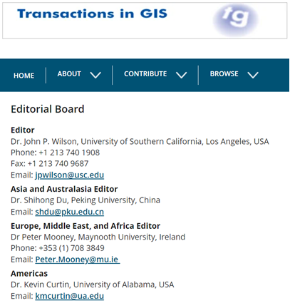 TGIS为美国约翰威立国际出版集团(Wiley)旗下地理信息科学研究领域国际权威学术期刊,创办于1986年,主要关注地理信息科学与遥感领域的研究,SSCI收录,影响因子2.406,每年出版8期约200篇学术论文。美国南加州大学John P. Wilson教授担任主编,杜世宏教授(负责亚太地区文章)、爱尔兰学者Peter Mooney(负责欧洲、中东和非洲地区文章)、美国学者Kevin Curtin(负责美洲地区文章)共同担任副主编。