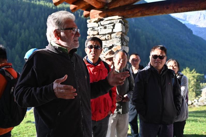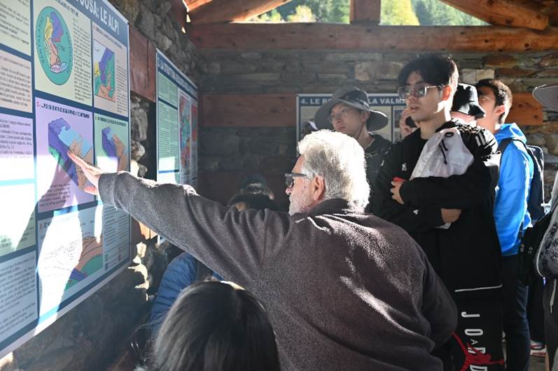 和煦的晨光中,Andrea教授带领大家登山山腰,遥望山峰,蔚蓝的苍穹下山耸森然,令人心生景仰。在路旁的科普站中,大家讨论起Valmalenco的构造背景。