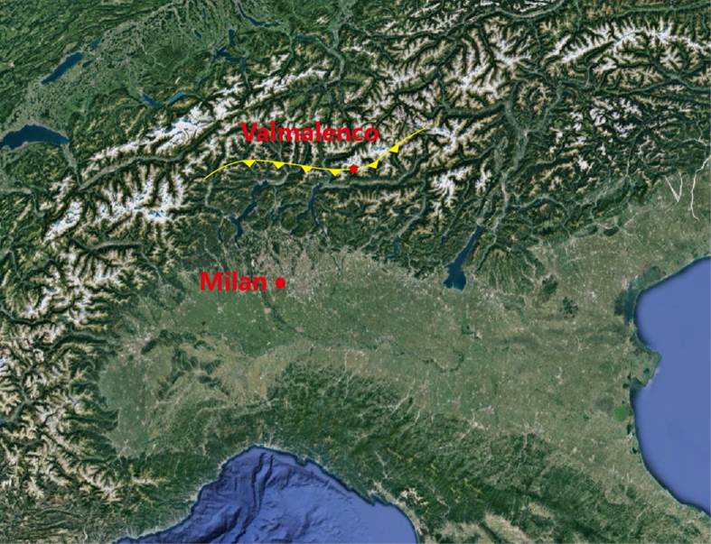 来自Tremogge、Scerscen、Pizzo Scalino的中生代沉积物、变质辉长岩、片麻岩、闪长岩等可能代表了古非洲板块的成分,来自Cima di Vazzola的中生代沉积物、云母片岩等可能代表了古欧洲板块的成分。