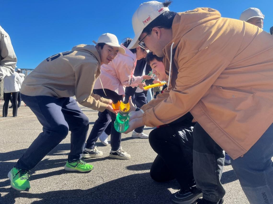 同学们完成了由“一圈到底”“不倒森林”“能量传输线”“激情节拍”等多个项目组合在一起的高难度项目——“挑战NO.1”。凭借着从活动开始以来培养起来的团队默契与协作精神,各个团队都顺利破除了障碍,在完成任务的同时,也更加深刻地认识到团队合作的必要性和重要性。各位同学在指定的画布上留下自己的痕迹,通过丰富的想象力和创造力,在有限的空间内留下了诸多地空的特色元素,展现了“脚踏实地,仰望星空”的学科精神。