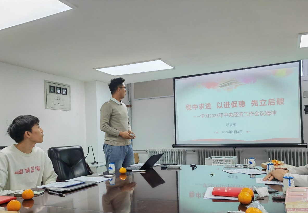 高君宇员工党支部书记邓玄宇以“稳中求进、以进促稳、先立后破”为主题领学中央经济工作会议精神。2023年12月11日至12日,中央经济工作会议在北京举行,习近平总书记出席并发表重要讲话。2023年是全面贯彻党的二十大精神的开局之年,是三年新冠病毒疫情防控转段后经济恢复发展的一年。以习近平同志为核心的党中央团结带领全党全国各族人民,顶住外部压力、克服内部困难,全面深化改革开放,加大宏观调控力度,使得我国经济回升向好,高质量发展扎实推进。邓玄宇分享了会议对2024年经济工作的部署,必须坚持“稳中求进、以进促稳、先立后破”工作的总基调,同时做到“积极的财政政策要适度加力、提质增效”,和“稳健的货币政策要灵活适度、精准有效”,以及“增强宏观政策取向一致性”,这样才能推动高质量发展,突出重点,把握关键,扎实做好经济工作。最后,他介绍了“新质生产力”这一热点概念:新质生产力是由技术革命性突破、生产要素创新性配置、产业深度转型升级而催生的当代先进生产力,它以劳动者、劳动资料、劳动对象及其优化组合的质变为基本内涵,以全要素生产率提升为核心标志。它的提出是对马克思主义生产力理论的创新和发展,也进一步丰富了习近平经济思想的内涵,既具有重要的理论意义,又具有深刻的实践意义。学习结束后大家纷纷表示,要进一步团结在以习近平同志为核心的党中央周围,坚定信心、开拓奋进,同时也要加强舆论宣传、教育和引导,唱响中国经济光明论,为以中国式现代化全面推进强国建设、民族复兴伟业作出自己的贡献。