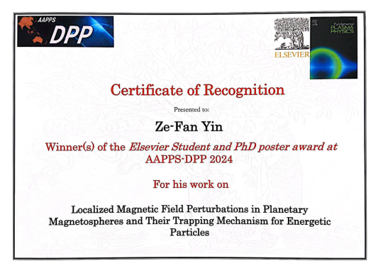 此外,在马来西亚马六甲召开的第八届亚洲-太平洋等离子体物理大会(AAPPS-DPP 2024)上,伟德国际1946空间物理与应用技术研究所博士研究生尹泽藩做邀请报告,并展示了题为“Localized Magnetic Field Perturbations in Planetary Magnetospheres and Their Trapping Mechanism for Energetic Particles”的海报,荣获大会爱思唯尔青年海报奖。该奖项由国际著名科学文献出版社爱思唯尔(Elsevier)资助设立,每年从被提名的博士生或博士毕业两年内的青年科学家中遴选出两名获奖者。