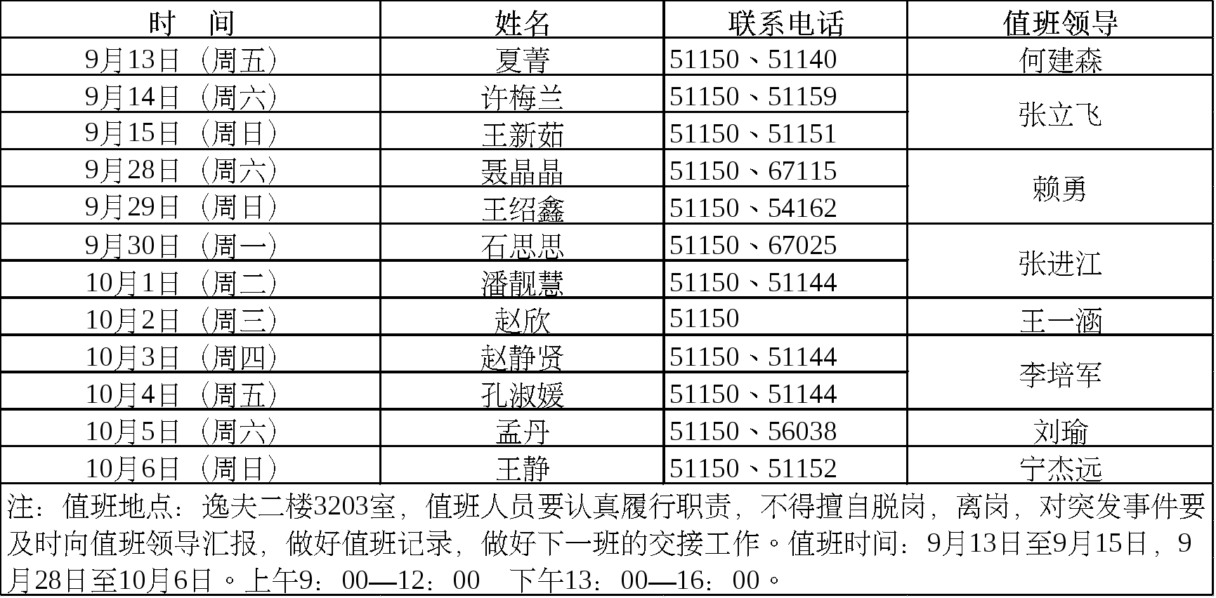 2019年中秋及国庆节期间行政人员及领导值班表