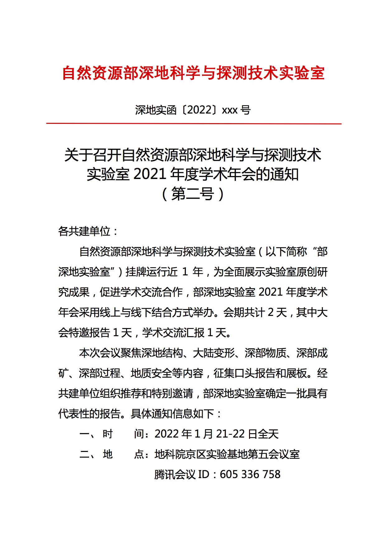 关于召开自然资源部深地科学与探测技术实验室2021年度学术年会的通知 (第二号)