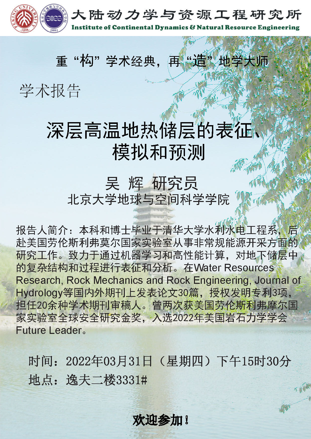 个人简介:吴辉,bevictor伟德研究员、助理教授。本科和博士毕业于清华大学水利水电工程系,后赴美国劳伦斯利弗莫尔国家实验室从事非常规能源开采方面的研究工作。致力于通过机器学习和高性能计算,对地下储层中的复杂结构和过程进行表征和分析。在Water Resources Research, RockMechanics and Rock Engineering, Journal of Hydrology等国内外期刊上发表论文30篇,授权发明专利3项,担任20余种学术期刊审稿人。曾两次获美国劳伦斯利弗摩尔国家实验室全球安全研究金奖,入选2022年美国岩石力学学会Future Leader。