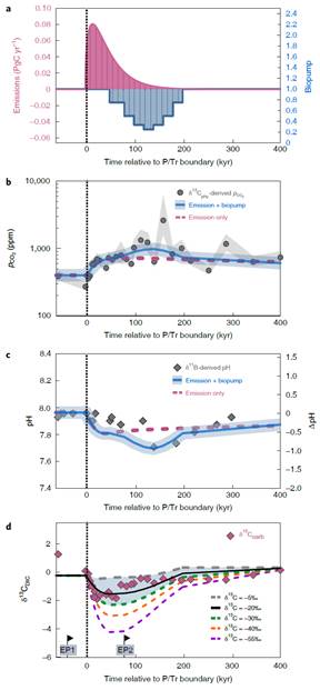 结合全球碳循环模型(Long-term Ocean-atmosphere-Sediment CArbon cycle Reservoir Model, LOSCAR)作者重塑了该时期气候和碳循环扰动的响应机制。研究认为第一幕灭绝时的低pCO2是由于西伯利亚早期(早于第一幕灭绝~300 kyr)大规模玄武岩喷发产生大量新鲜可风化物质而非强烈排气作用。此阶段脉冲式风化能力的增强可有效抑制大气中二氧化碳的累积,并带入大量营养盐和矿物至海洋,增加海洋碱度,缓冲海洋碳酸盐平衡体系和海水pH值变化;而营养盐的大量输入导致海洋富营养化,促使真核藻类繁盛,此条件伴随着高生产力出口导致海洋出现短暂且严重的缺氧环境,从而使得生物灭绝。