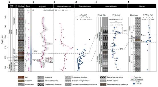 图2:基于生物标志化合物单体同位素重建的二叠纪末生物大灭绝时期大气二氧化碳浓度及古海洋初级生产力群落结构的演化