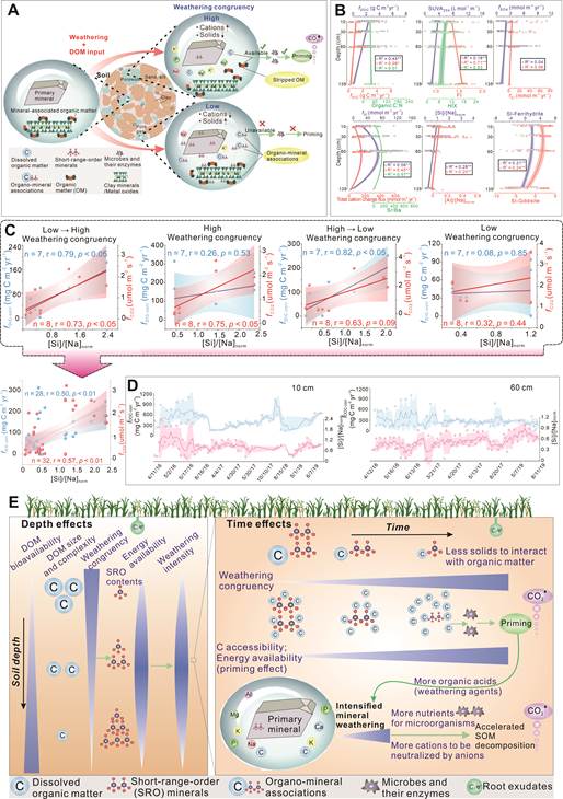 图1(A)矿物风化影响微生物碳激发效应示意图; (B)重要生物地球化学和矿物学参数随深度变化曲线;(C)矿物风化协调性对有机质矿化速率的控制;(D)矿物风化协调性与DOC通量在不同深度呈现不同耦合规律;(E)矿物风化与微生物碳激发过程之间的联系在时间和空间尺度上的表现。