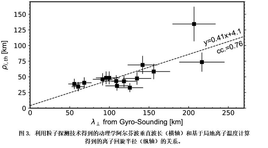 将这一方法初步应用于MMS卫星的探测数据,宗秋刚教授团队识别出了15个动理学阿尔芬波事件,并计算了这些波动的垂直波长。具体分析表明,这些动理学阿尔芬波的垂直波长和基于局地离子温度计算得到的回旋半径具有较好的相关性。如图3所示,前者约为后者的2.4倍。这一结果从观测上证明了动理学阿尔芬波的离子尺度特性,并表明了粒子探测技术对动理学阿尔芬波研究的重要意义。