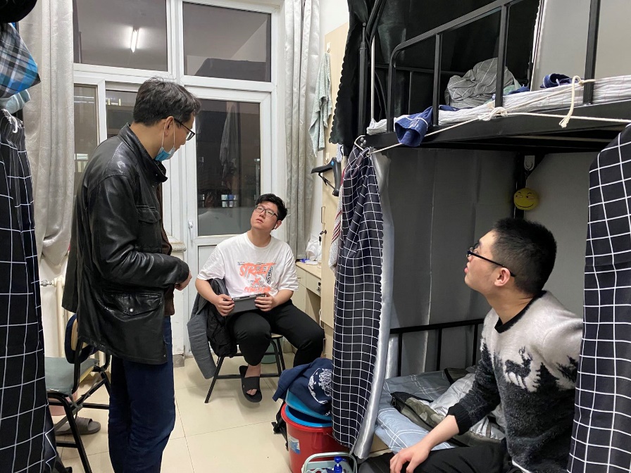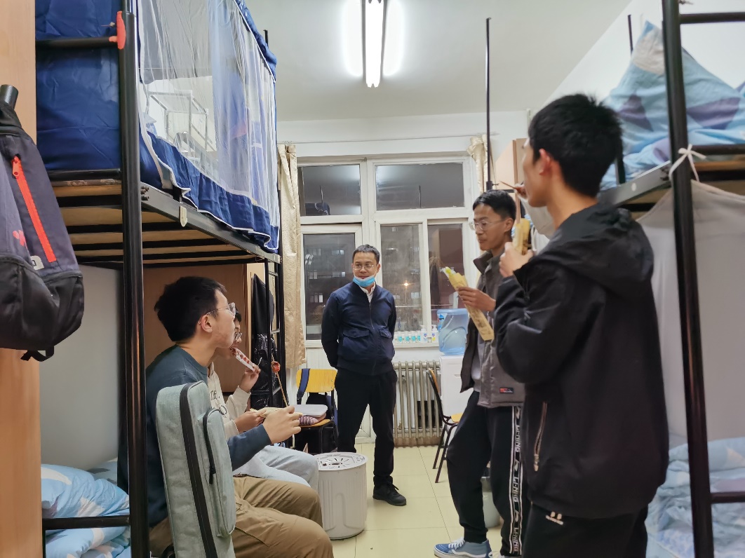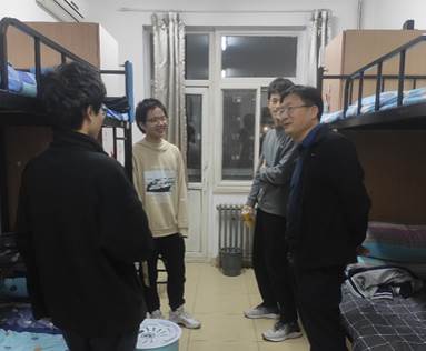 老师们对本科生宿舍逐个进行走访慰问,给每位同学都分发了糖葫芦,并与大家进行了深入交流讨论,询问了同学们期中考试、本科生科研和近期生活状态等基本情况,并对同学的问题和诉求进行了认真地回答。