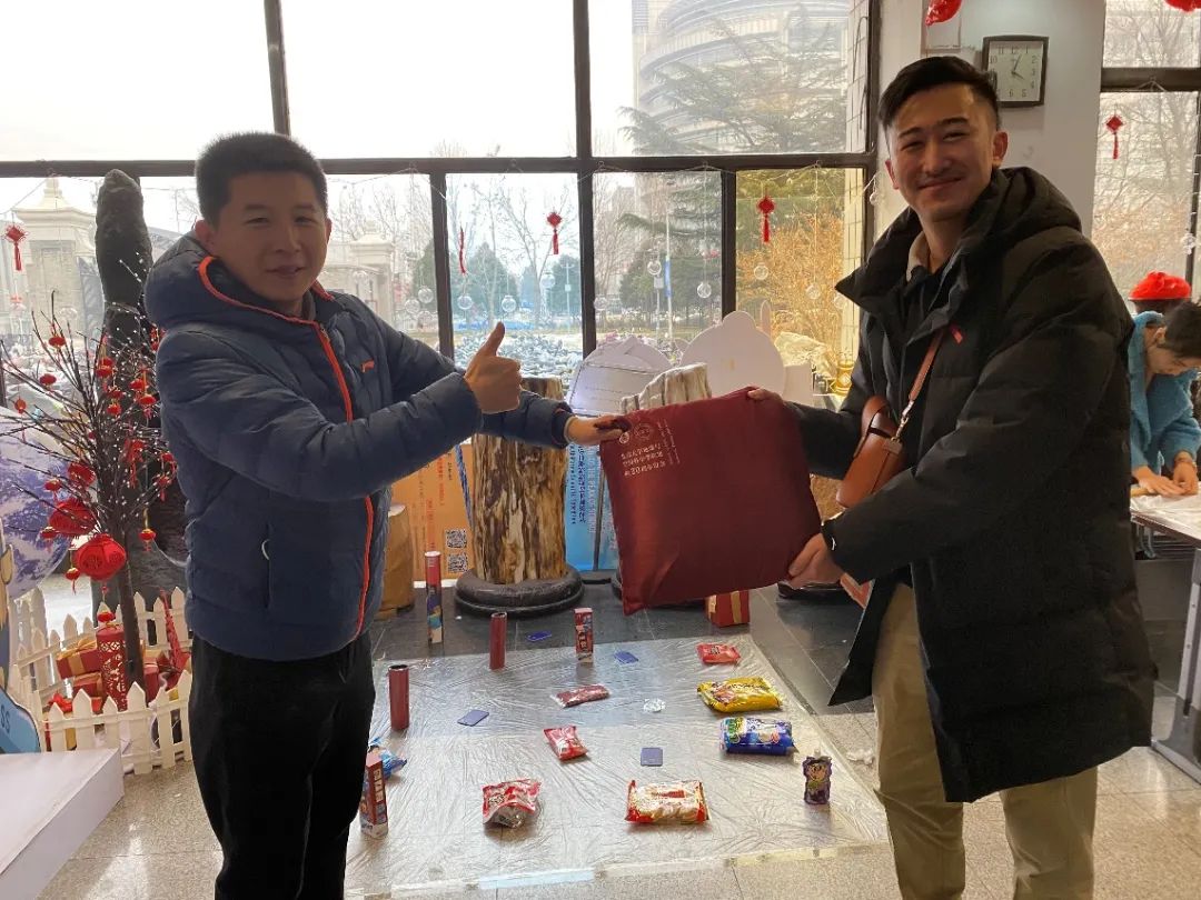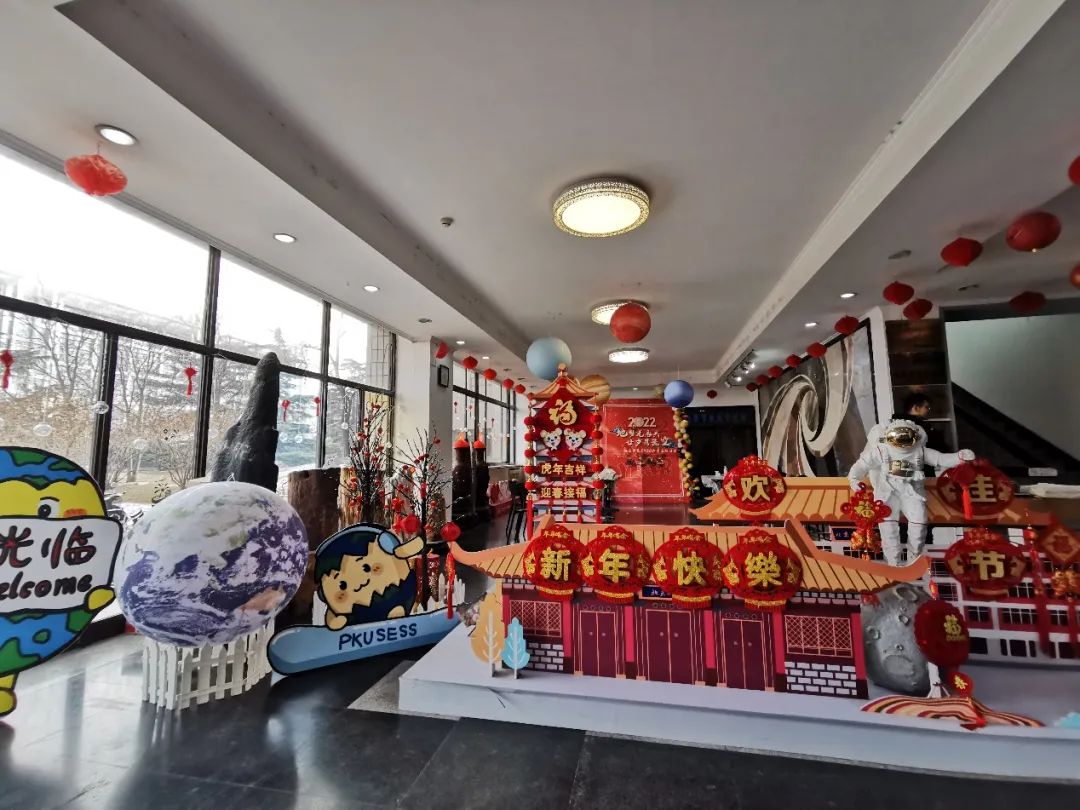 公司精心装点了逸夫贰楼大厅,现场喜气洋洋,充满了节日氛围。