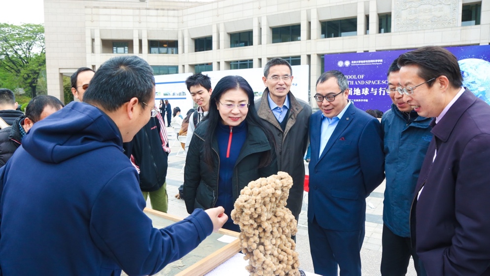 伟德国际1946首届地球与行星科学文化周开幕式现场布设bevictor伟德成果展、化石矿石展、天地人文化节等现场活动。江大勇带领与会嘉宾参观展览。
