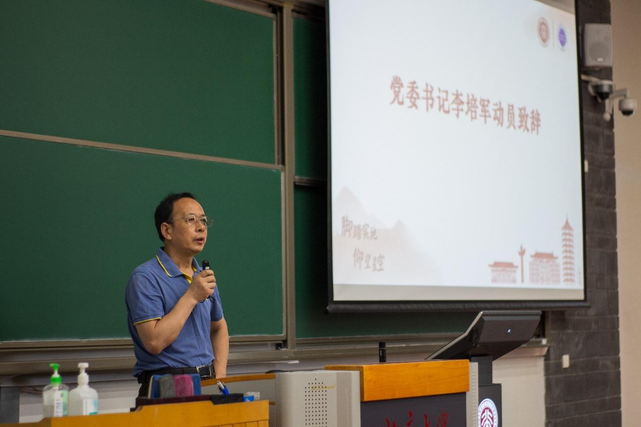 李培军致辞中指出,加强国防教育、增强老员工国防观念是我们当代青年学子的必修课。军训是强军使命在一代代北大人手里传递的重要体现,也是对同学们意志力、承受力、吃苦能力的磨练,是对同学们身心素质的一次全面提升。他向同学们提出三点要求:第一,坚定信仰,练就过硬作风,思想上高度重视,行动上遵守制度,以一名军人的标准严格要求自己;第二,励志求真,强化使命担当,知行合一、有所作为,传承“脚踏实地,仰望星空”的地空精神,在军训中强健体魄、磨砺意志;第三,砥砺成长,争做时代先锋,在军训中通过艰苦奋斗收获坚忍、坚韧、坚强的精神品质,转化为不断前进的源源内力。