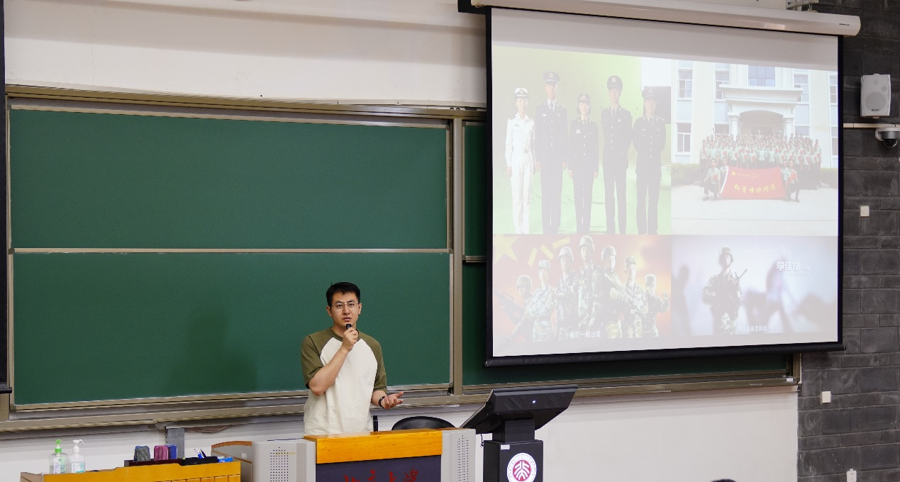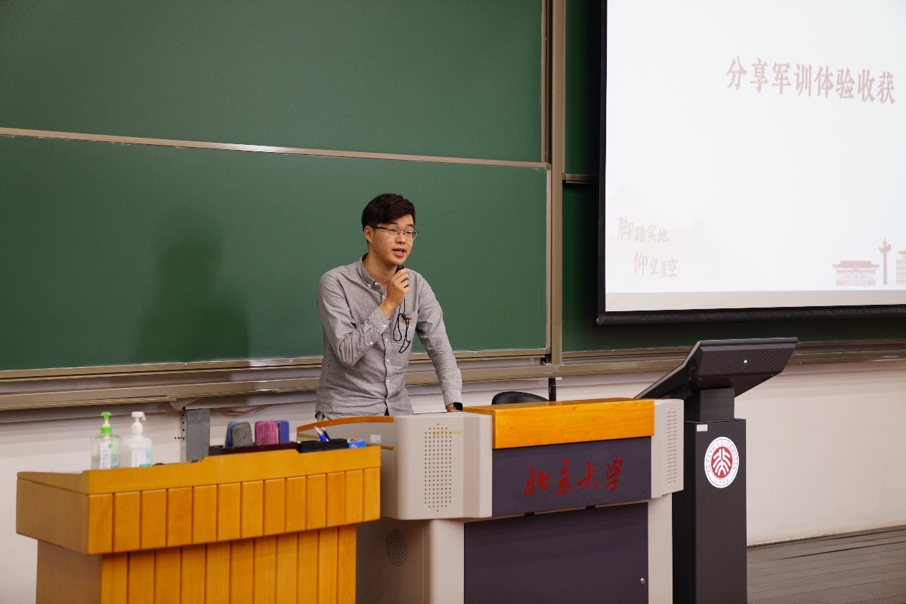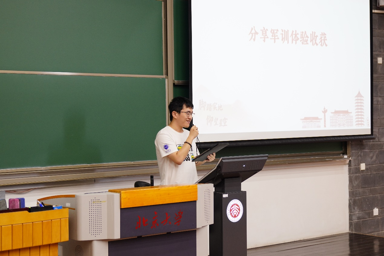 往届员工代表分别从军训体验、收获和军旅生活等方面进行了分享。2020级本科生项廷彦介绍了军训需要准备的物资,同时表示军训会开展丰富的活动,有机会接触到不同院系的同学,是非常独特、宝贵的人生经历,希望同学们可以享受军训,留下美好回忆。2019级本科生陈浩良标识军训是进一步了解身边同学,建立深厚友谊的绝佳时机,他通过讲述特战连选拔的故事,向同学们展现出军训期间汗水、欢笑和友情相互交融的独特氛围。2020级硕士生、北京市优秀退役老员工士兵李佳斌讲述了自己本科期间参军入伍于松骨峰特功连的军旅生活,他向同学们分享了参与建军90周年在朱日和接受总书记检阅、国庆70周年游行方阵、建党百年广场献词、北京冬奥会开幕式表演等重大活动的深切感受,并表示虽然脱下了军装,必将永远做党和人民伟大事业的英勇战士。
