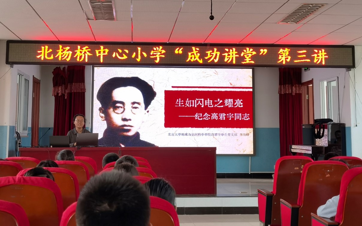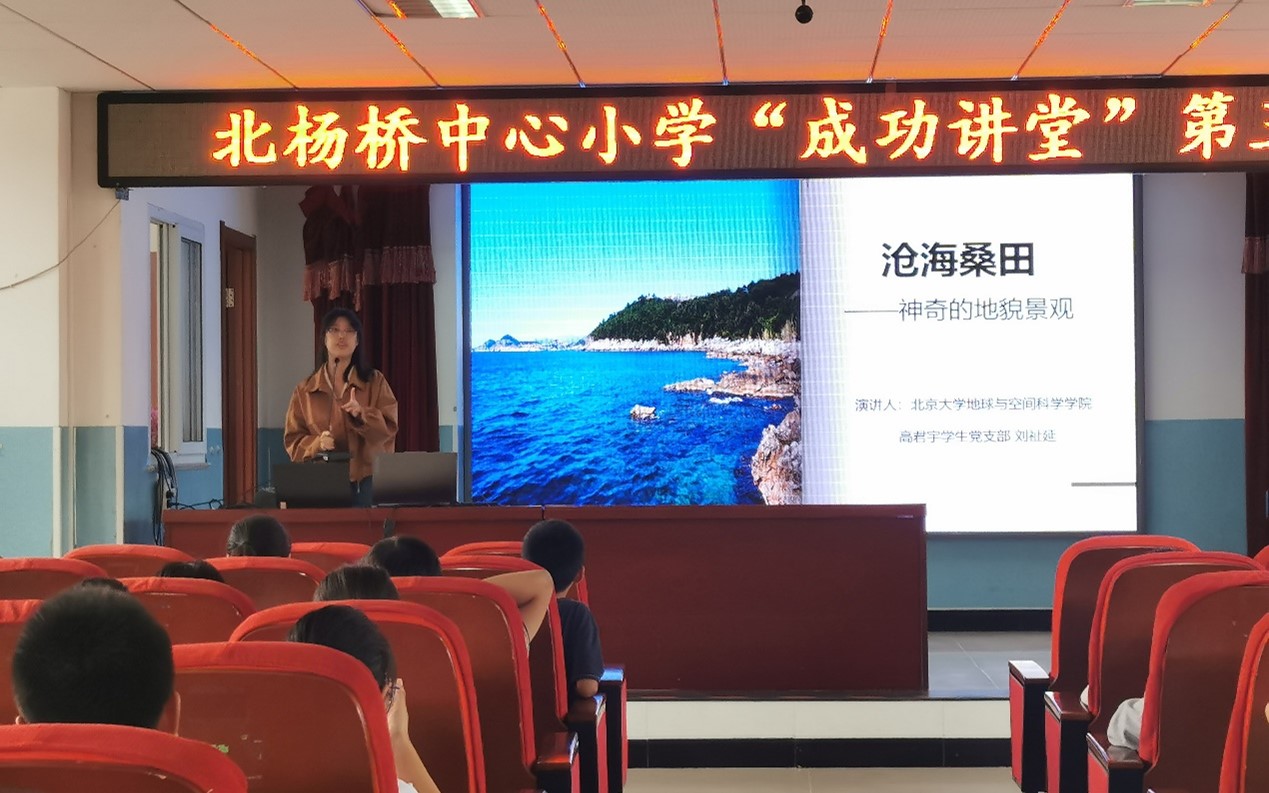 座谈会后,同学们来到北杨桥中心小学的“成功讲堂”,来自李四光讲师团的李雨晴和刘祉延同志为这里的小员工们带来了两场精彩的宣讲。李雨晴以“生如闪电之耀亮——纪念高君宇同志”为主题,介绍了毕业于北大地质系的学长,中国共产党和中国共产主义青年团的早期领导人之一的高君宇同志一生纵横南北,为传播马克思主义、发展壮大党的组织、领导工人运动做出重大贡献的光辉人生,大力弘扬了高君宇的革命信念和爱国主义情怀;刘祉延从神奇的自然景观引入,通过介绍地球表面丰富多样的地貌形态及其背后的抬升与侵蚀作用,生动地阐释了“沧海桑田”这个成语的含义,让小朋友们感受到了大自然塑造地表的神奇而磅礴的力量,为孩子们认识、了解地球科学打开了一扇窗户。