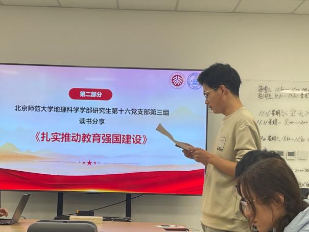 活动开始,由北京师范大学地理科学学部研究生第十六党支部书记戴湘龙作开场发言。他介绍,这次活动期望各位党员同志通过学习习近平总书记关于教育方面论述,深化对教育在党和国家战略中的重要地位的理解,增强推动教育事业发展的责任感和使命感。