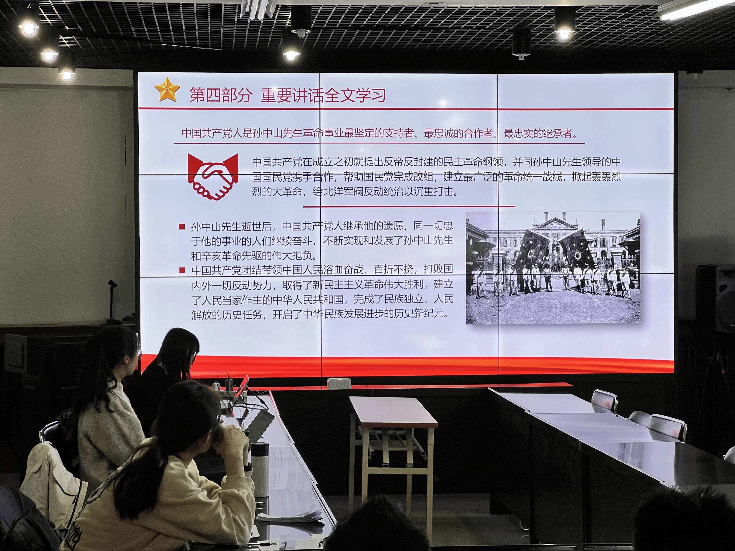 纪律检查委员杨桃汝同学带领支部成员回顾了辛亥革命历史,讲述了其对后续五四运动、中国共产党接过历史接力棒的重要意义。观看新华社制作的振奋人心的视频后,杨桃汝同学又从会议概况、辛亥革命成果、辛亥革命的意义、习近平重要讲话全文学习,以及大会内容总结几个方面对纪念会议进行了介绍和回顾。