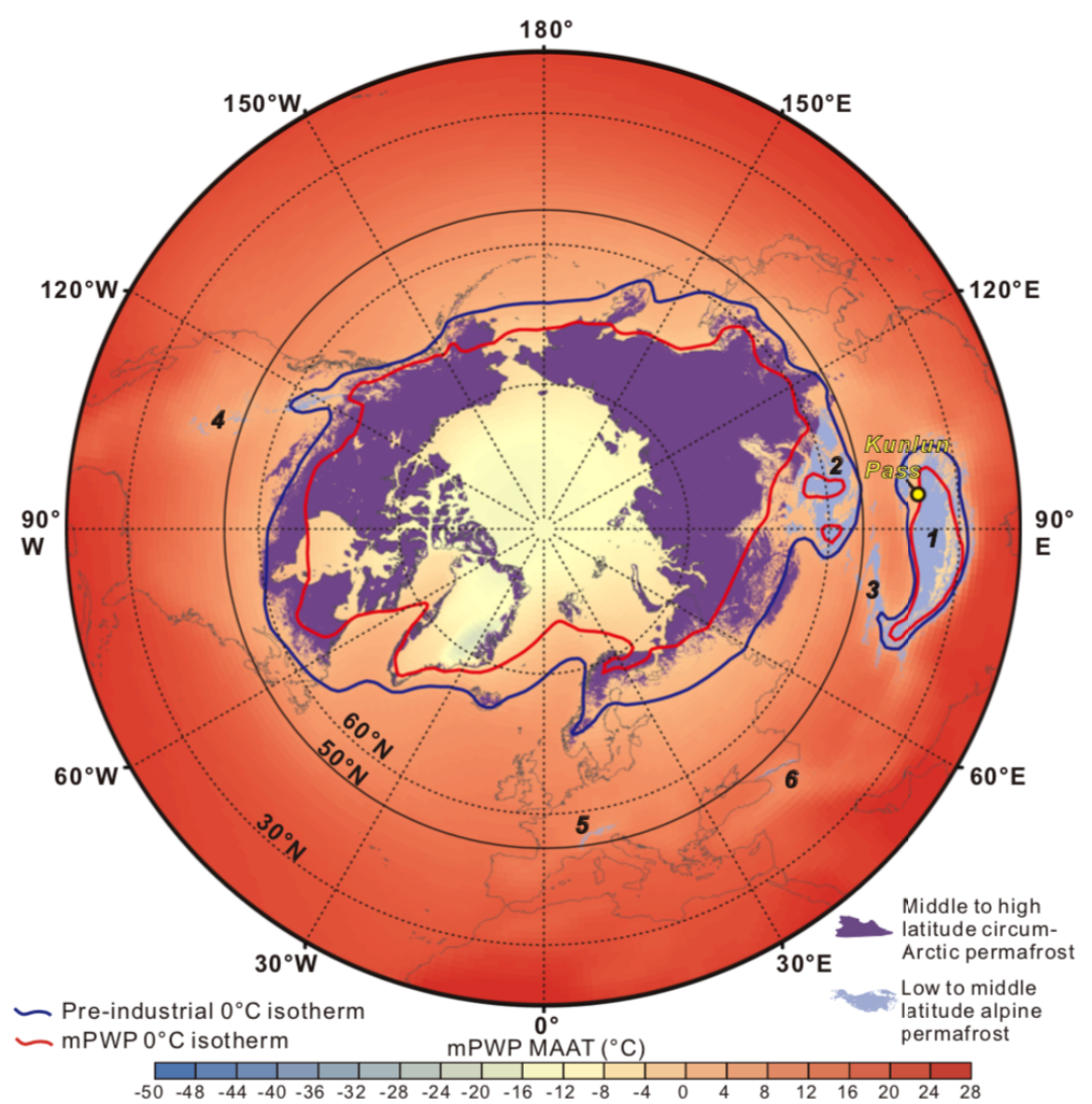 研究结果指出:1)青藏高原北缘的年均气温度在2.7 Ma前后降低了近8°C,全球在北半球冰期的气候变冷是该地区大幅度降温的主要驱动因素,青藏高原该时间段的构造隆升不显著;2)在上新世暖期类似气候条件下,现今地球上近20%的环北极圈冻土区将消融,近60%的高山冻土区将消融,分别释放~253 Pg和~85 Pg的碳,高山冻土区释放的碳占所有冻土区碳释放总量的近四分之一;3)高山冻土是全球变暖的背景下的重要碳源,其碳排放占比远高于环北极圈冻土区。