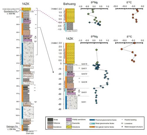 沈冰课题组对我国贵州省东北部南沱组冰期沉积和陡山沱组底部的盖帽碳酸盐岩中所包含的陆源碎屑组分的镁同位素组成进行了分析。由于在化学风化过程中岩石中的镁会发生显著的同位素分馏,使得风化残余物中富集重的镁同位素(26Mg),而且26Mg的富集程度与化学风化强度直接相关,因此镁同位素可以用来指示地质历史时期的化学风化强度。研究表明,南沱组上部地层中出现了一次显著的镁同位素正漂移(26Mg富集),而盖帽碳酸盐岩中的镁同位素值已经显著降低。这表明在Marinoan冰期结束过程中的确伴随有强烈的化学风化作用,支持了雪球地球假说。但与雪球地球假说的预测不同,最强化学风化作用要显著早于盖帽碳酸盐岩的沉积,这说明盖帽碳酸盐岩沉积时全球冰期已经结束了。