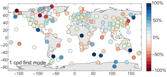图1. 全球地磁台网台站分布与日变数据拟合相对误差。