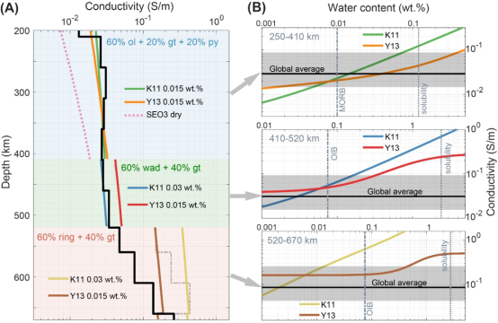 图2. (A)陆地平均电导率-深度剖面。(B)矿物电导率随含水量的变化。