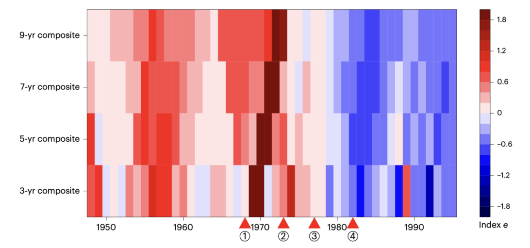 图4 堤防效应指数的时间动态变化。三角形表示主要洪泛区管理政策的年份。
