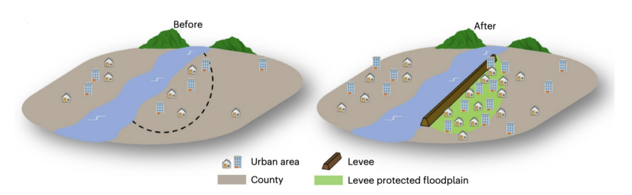 洪水是塑造地表过程的一种自然营力,而近年来洪泛区内城市建成区的扩张以及人口增长导致了洪水暴露度增加,致使洪水致灾问题愈发严峻。林佩蓉课题组近期在探究洪泛区内城市建成区的扩张模式时,注意到堤防保护的洪泛区内城市建成区分布更为密集(图1),而这一现象与堤防效应(leveeeffect)直接关联。