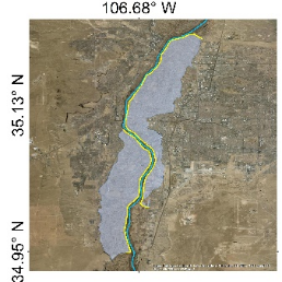 (黄色线条为堤防,淡蓝色阴影为堤防保护的洪泛区,从左至右区域分别为Larksville, PA; Louisville, KY; Chico, CA; Albuquerque, NM)