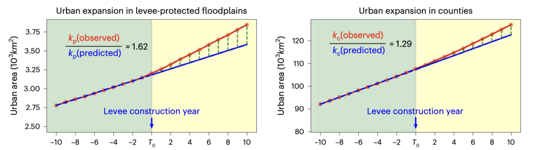 本研究基于合成分析(Composite Analysis)和时间/空间控制变量方法,结合美国堤防数据集(National Levee Database, NLD)提供的千余个堤防要素数据集(NLD)和美国国家地质调查局(USGS)提供的近70年年尺度土地覆盖变化数据,分别提取了千余组堤防保护洪泛区内及相应行政单元内的城市建成区增长曲线。研究结果表明,在堤防建设10年内,堤防保护的洪泛区内建成区扩张速率平均上升了62%,而相应郡级行政单元内建成区扩张速率仅上升了29%,这揭示了人们由于堤防的保护作用而对洪泛区内的灾害风险认知下降,并更倾向于在洪泛区内发展(图3)。