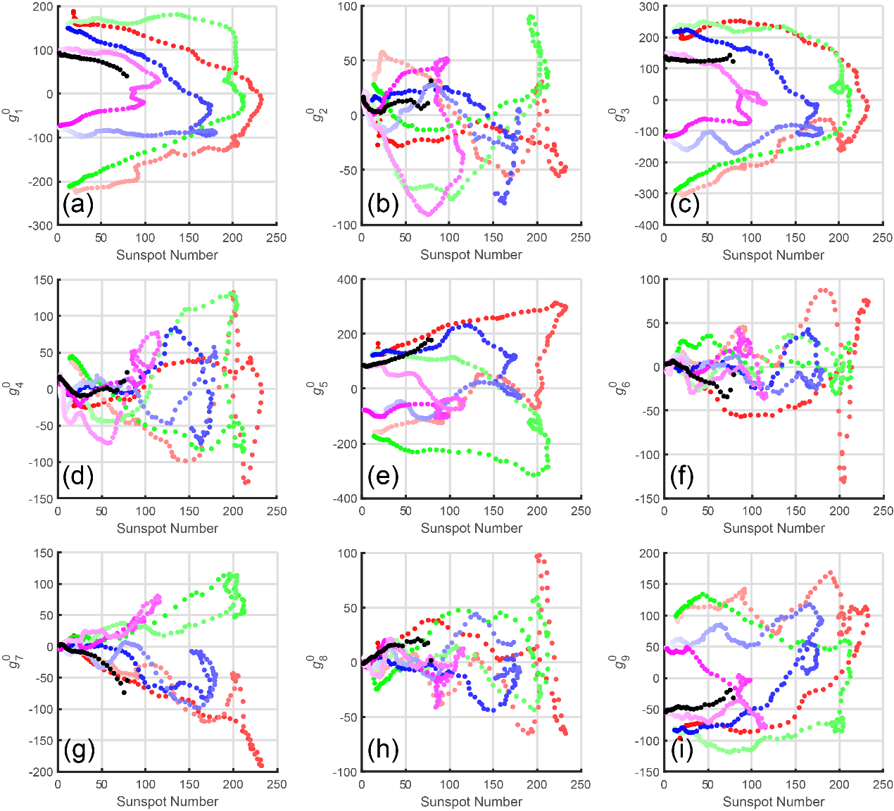 图2. ISN与m=0的各个球谐系数的李萨如图。用于绘图的球谐系数时间序列已预先通过13个月的移动窗口进行平滑处理。不同的颜色代表不同的太阳活动周, 在一个周期内颜色逐渐从深到浅。