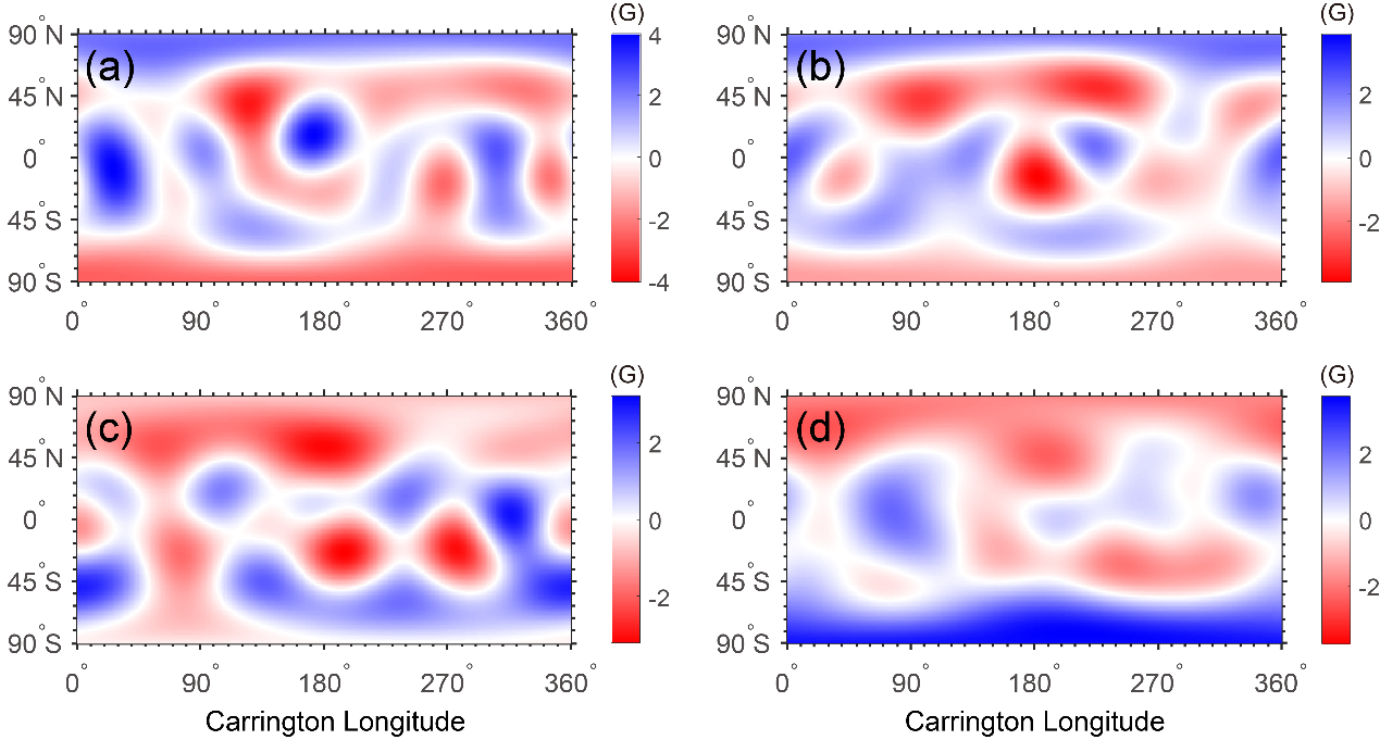 图5. 截断到5阶的综合磁图预测结果。(a) CR2271, 当前活动周的上升相; (b) CR2278, 临近下一次极性反转; (c) CR2286, 完成下一次极性反转; (d) CR2361, 下一个太阳活动谷年。卡林顿周的选择基于对SC25的ISN峰值的预测, 即峰值将于2024年6月前后到达(CR2284)。