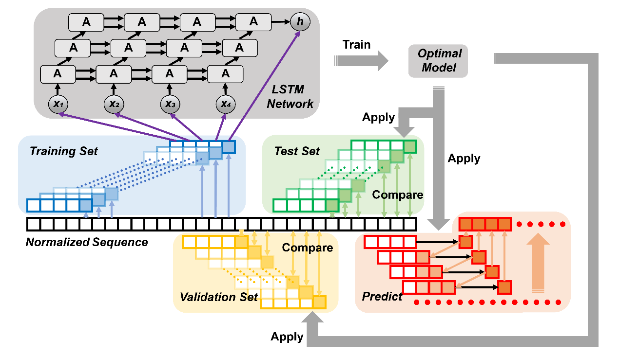 图3. 基于LSTM网络进行ISN时间序列的建模、训练和预测过程的示意图。