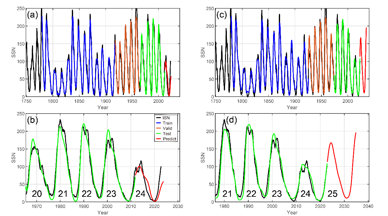 图4. 基于LSTM模型的ISN预测。(a)和(b)为SC 24的预测结果,(c)和(d)分别为SC 25的预测结果。黑线表示13个月平滑的月度ISN序列, 红线表示未来12年的预测值, 蓝线表示训练集上的模型预测, 橙线表示验证集上的模型预测,绿线表示测试集上的模型预测。(b)和(d)底部的数字表示太阳活动周的编号。