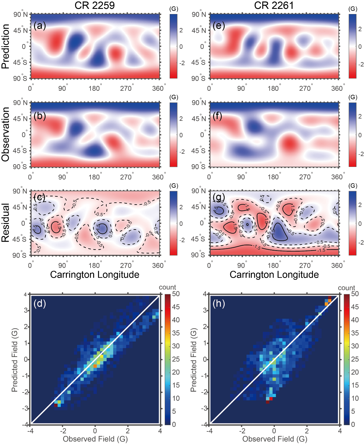 图6. CR2259(左列)和CR2261(右列)的预测磁图与观测磁图的比较(a)和(e)是预测磁图; (b)和(f)是观测的WSO磁图; (c)和(g)是用预测磁图减去观测磁图得到残差磁图, 其中实线标记了残差为±1.5G的等值线, 虚线标记了残差为±0.5G的等值线; (d)和(h)是观测磁场与预测磁场的散点分布。